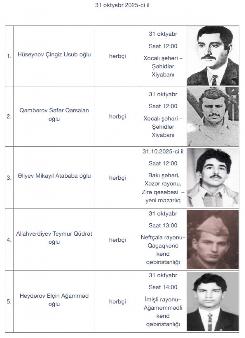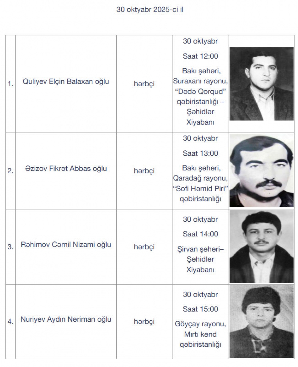 İtkin şəhidlər oktyabrın 28-i, 29-u, 30-u və 31-də Bakı və regionlarda dəfn olunacaqlar.