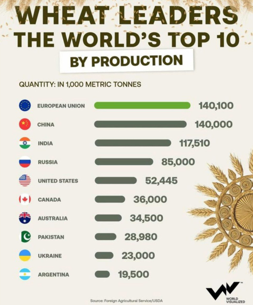 Dünyanın on ən iri buğda istehsalçıları (milyon tonla) aşağıdakı kimidir: