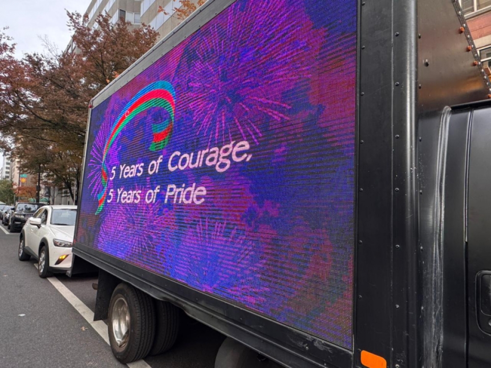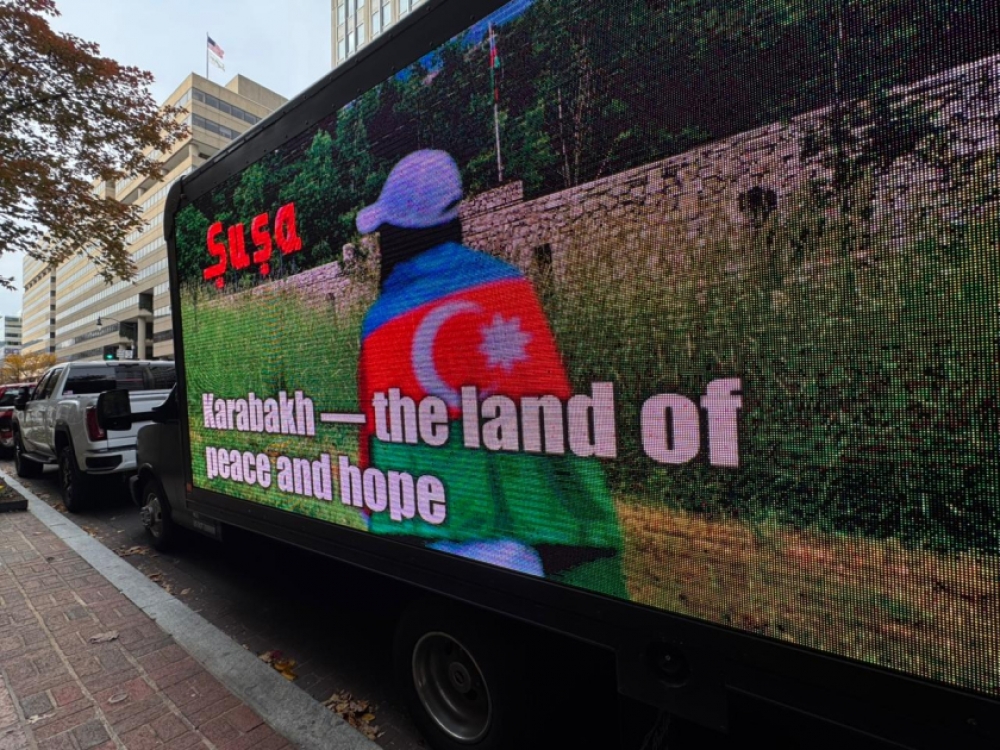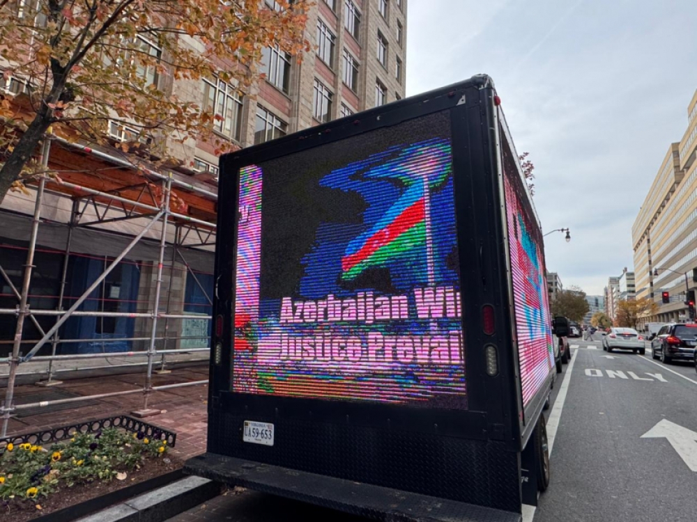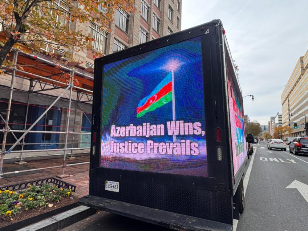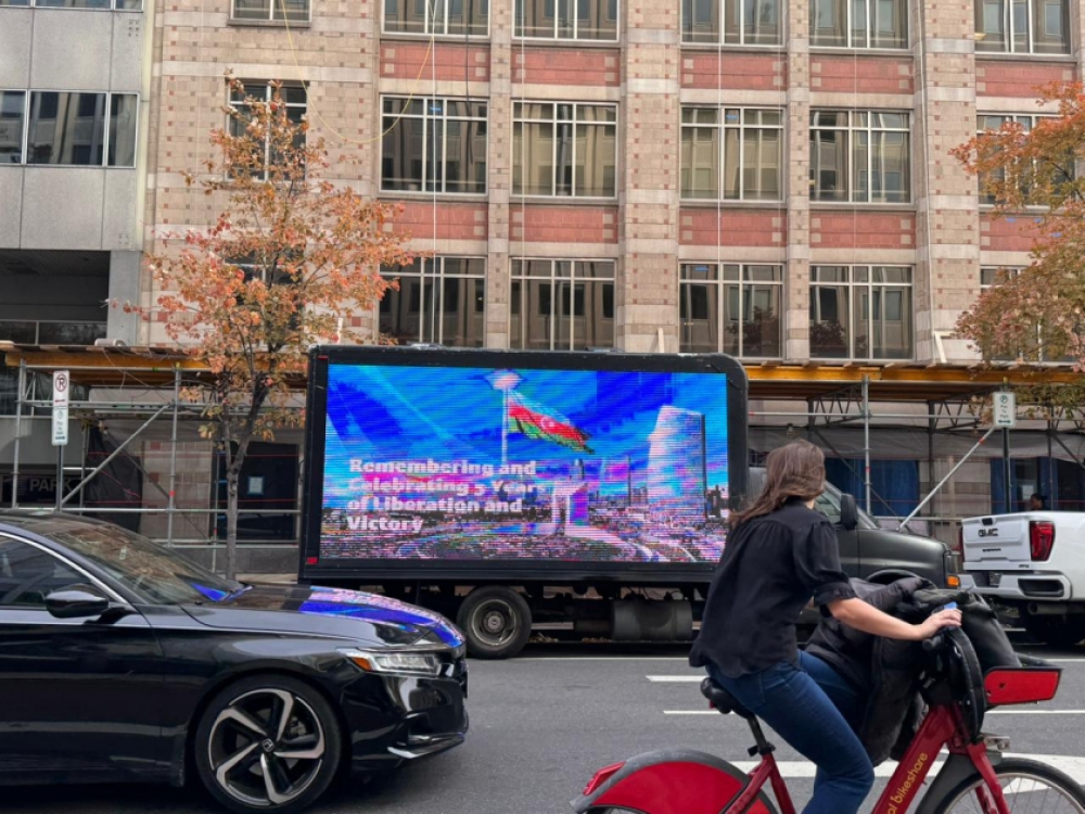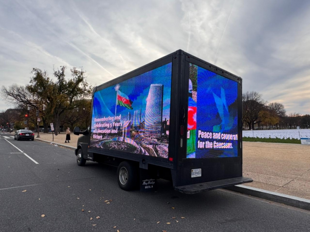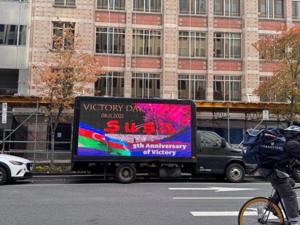 “İki sahil” xəbər verir ki, Azərbaycanın qələbəsinə və Zəfər Gününə dair şüarların nümayiş olunduğu led ekranlı avtomobil ABŞ-ın əsas prospekt və küçələrində hərəkət edib. Ekranda “Cəsarətin 5 ili, qürurun 5 ili”, “Azərbaycan qalib gəldi, ədalət zəfər çaldı”, “Qələbəni mümkün edənləri anırıq”, “Birlikdə Qarabağda dayanıqlı sülh naminə”, “Qarabağ - sülh və ümidlər torpağı”, “Qafqazda sülh və əməkdaşlıq” və sair şüarlar yer alıb. Avtomobil 4 saata yaxın Ağ Ev, Vaşinqton abidəsi, Kapitol, Linkoln Memorialı kimi məşhur binaların yerləşdiyi küçələrdə hərəkətdə olub.