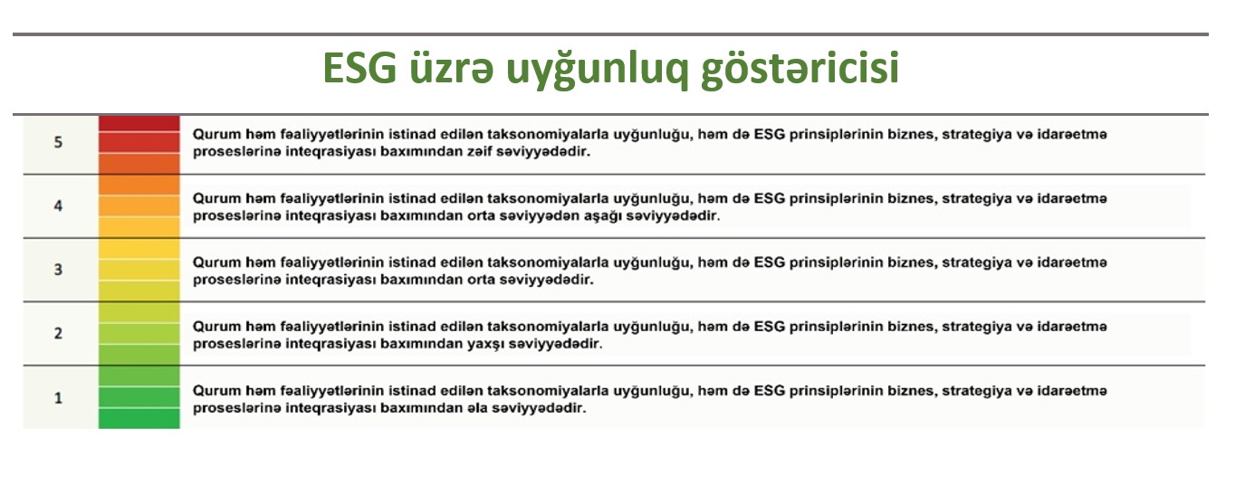“Sustainable Fitch Ratings” təşkilatın ekoloji və sosial amilləri öz biznesinə, strategiyasına və idarəetməsinə inteqrasiya etmə səviyyəsini, eləcə də ümumi fəaliyyətini, öhdəliklərini və idarəetmə effektivliyini qiymətləndirir. Reytinqlər “1”-dən “5”-ə qədər şkala üzrə təqdim olunur (burada “1” ən yüksək, “5” isə ən aşağı göstəricidir).