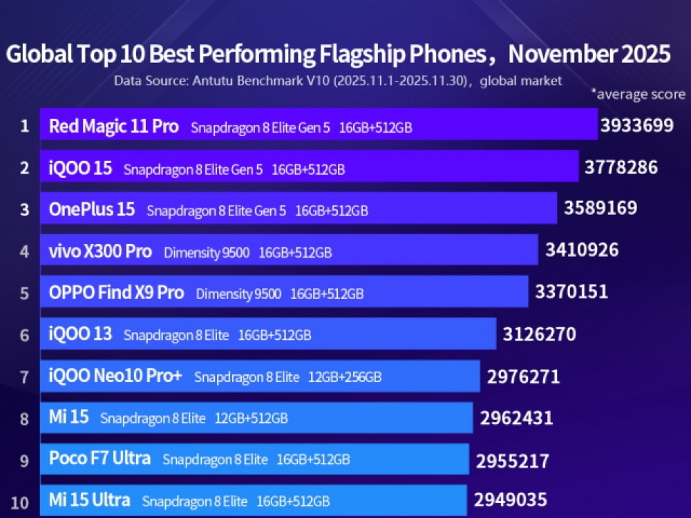 “İki sahil” xəbər verir ki, gözlənilməz şəkildə "Apple"ın flaqmanı "iPhone 17" ilk 10-luğa daxil olmayıb. Siyahıya "Snapdragon 8 Elite Gen5 " prosessorlu "Red Magic 11 Pro" liderlik edir, ikinci yerdə "iQOO 15", üçüncü sırada isə "OnePlus 15" qərarlaşıb.