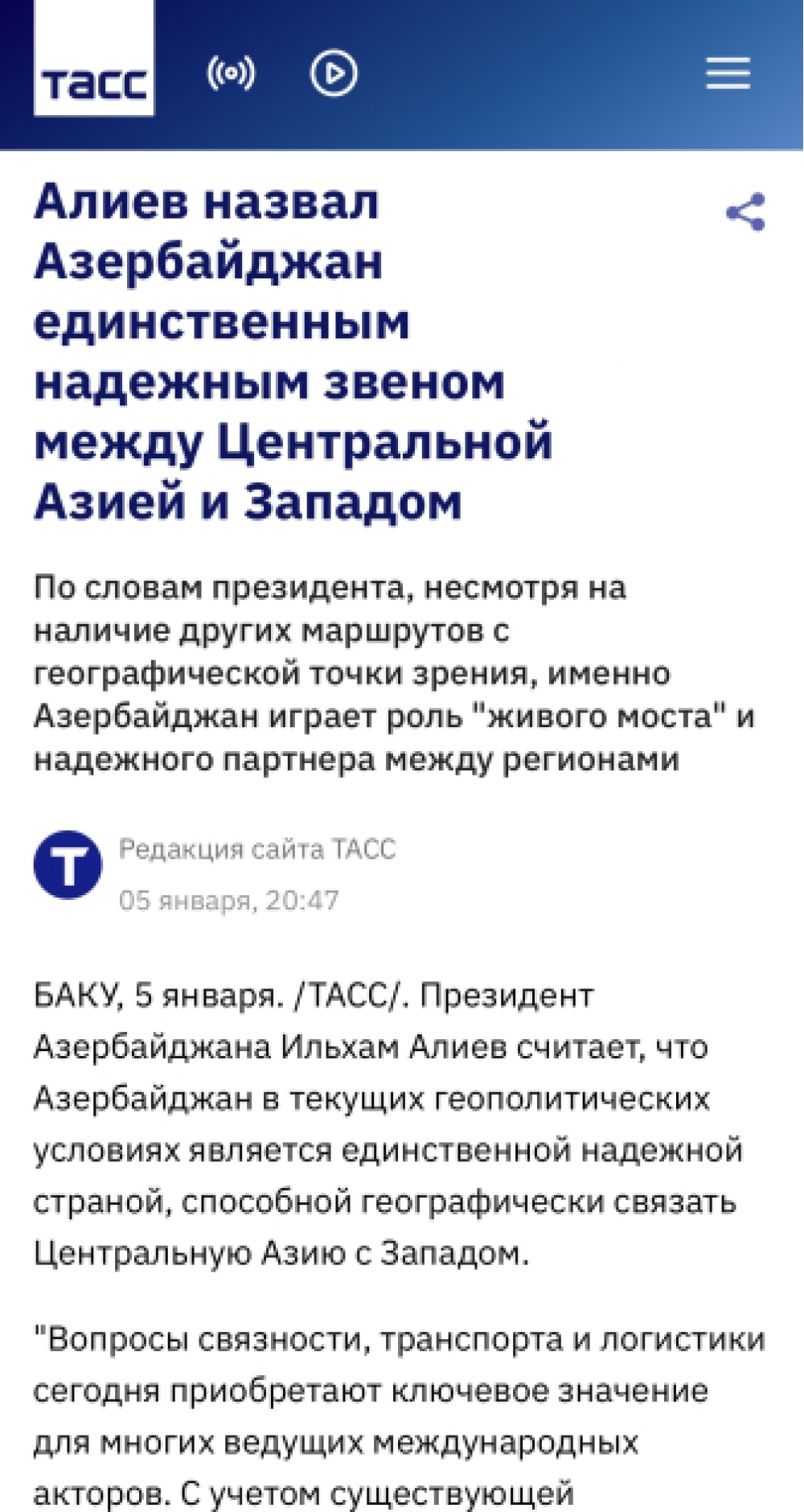 Medianın materiallarında Prezident İlham Əliyevin Azərbaycanın tranzit imkanlarının gələcəkdə daha da genişlənəcəyinə əminliyi diqqətə çatdırılır, Avropa və Asiya məkanında iqtisadi əlaqələrin möhkəmləndirilməsi kontekstində nəqliyyat infrastrukturunun inkişafının vacibliyi xüsusi qeyd edilir.