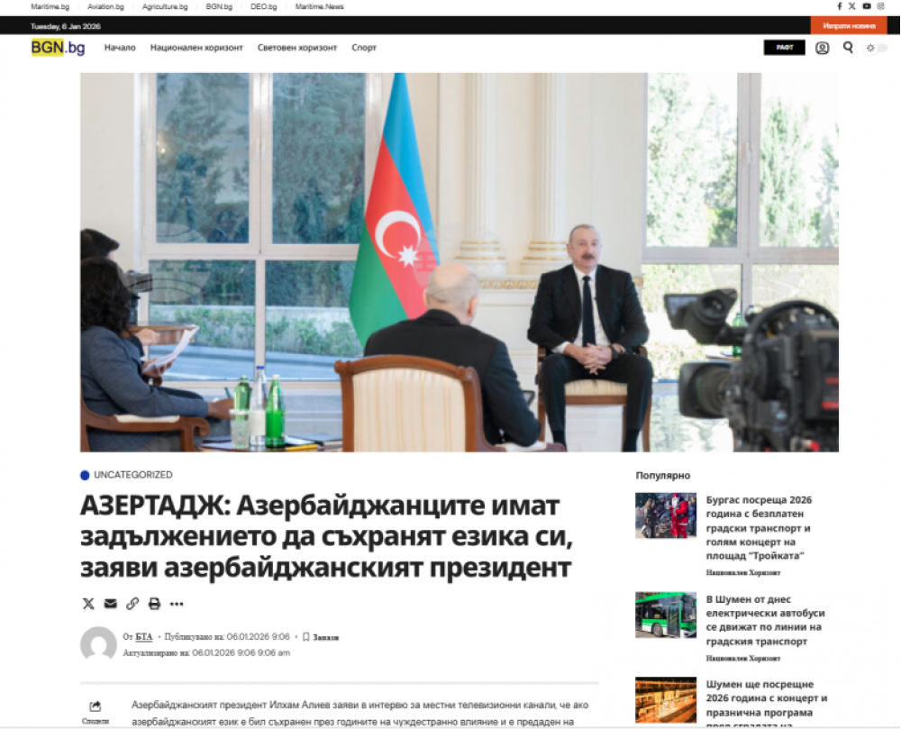 Bolqarıstan Teleqraf Agentliyinin, “Delnik” nəşrinin, BGN xəbər portalının AZƏRTAC-a istinadla dərc etdikləri “Azərbaycan Prezidenti azərbaycanlıların öz dövlət dilini qorumalarının vacibliyini vurğulayıb” sərlövhəli məqalədə Prezident İlham Əliyevin dövlət dilinin qorunması və inkişafı ilə bağlı fikirləri yer alıb.