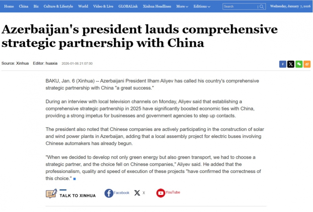 “İki sahil” xəbər verir ki, Çinin milli xəbər agentliyi “Sinxua”nın Azərbaycan Prezidenti İlham Əliyevin yerli televiziya kanallarına müsahibəsi zamanı Azərbaycan-Çin münasibətlərinə dair fikirləri haqqında xəbərləri Çin mediasında geniş yayılıb.