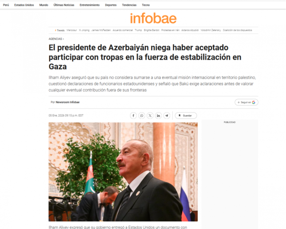 İspaniyanın “Communicacion” portalının AZƏRTAC-a istinadla dərc etdiyi materiallarda qeyd olunub ki, Prezident İlham Əliyev Azərbaycan hərbçilərinin ölkənin hüdudlarından kənarda heç bir hərbi əməliyyatlarda iştirak etmədiyini və bunun gələcəkdə də nəzərdə tutulmadığını bildirib. İspan saytı bununla bağlı yanlış məlumatları təkzib edən dövlətimizin başçısının sözlərini sitat gətirir: “Biz 20 sualdan ibarət müraciət tərtib etdik və onu Amerika tərəfinə çatdırdıq. Bu məsələlərə aydınlıq gətirilməyincə, Azərbaycanın hər hansı missiyada heç bir iştirakı nəzərdə tutulmur”.