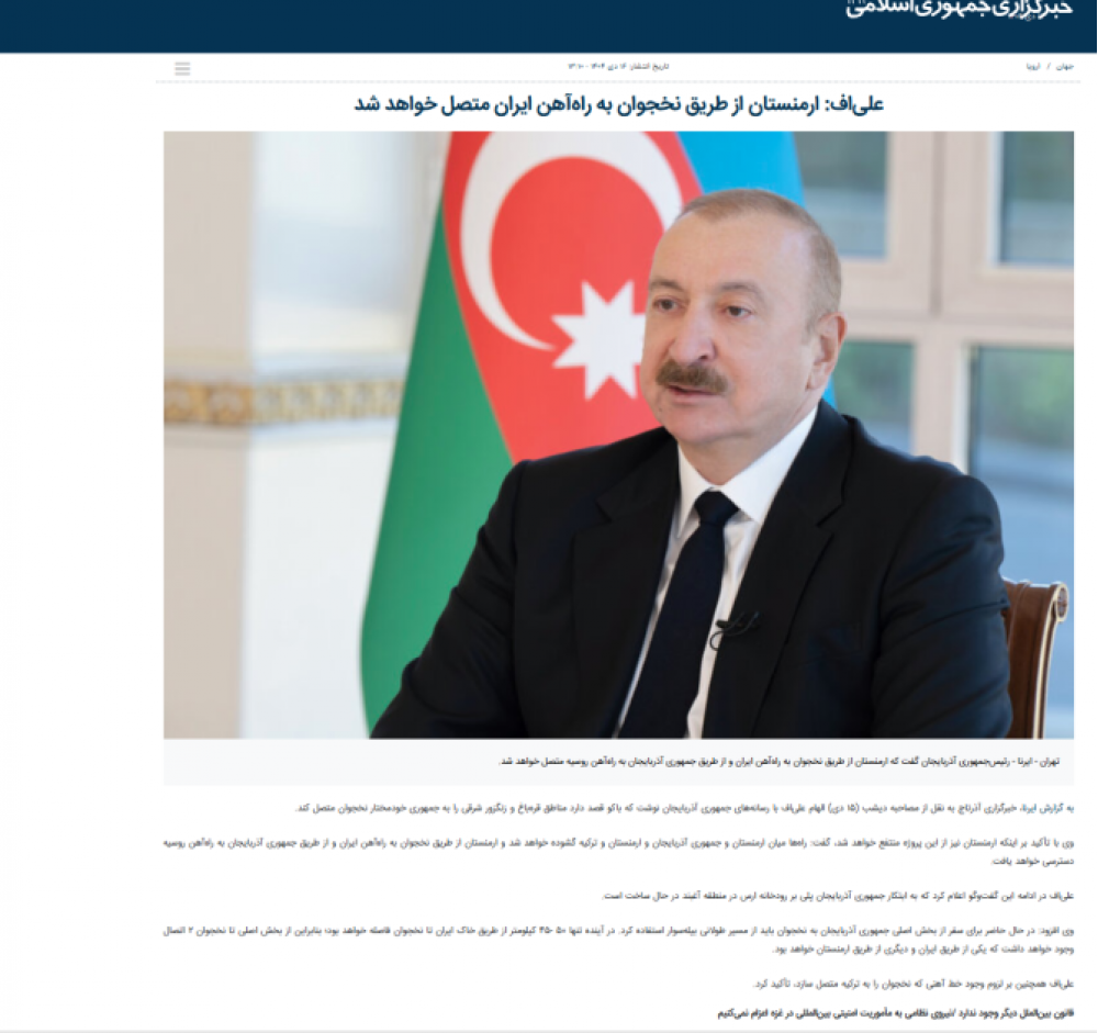 İranın IRNA dövlət agentliyinin, ISNA xəbər agentliyinin saytlarında, “Ğatreh”, “Tahlil Bazar”, “Tejaratnews” xəbər portallarında dərc olunmuş “Prezident Əliyev Ermənistanın Naxçıvan marşrutu ilə İran dəmir yoluna qoşulacağını bəyan edib” sərlövhəli məqalələrdə Azərbaycanın dövlət başçısının Ermənistanın Naxçıvan vasitəsilə İran dəmir yoluna, Azərbaycan Respublikası vasitəsilə isə Rusiya dəmir yoluna çıxış əldə edəcəyi barədə fikirləri yer alıb. Materiallarda vurğulanır ki, Prezident İlham Əliyev Ermənistan sərhədinə gedən həm dəmir yolunun, həm avtomobil yolunun tezliklə hazır olacağını bildirib. Azərbaycan lideri əlavə edib ki, bu layihə tam başa çatandan sonra onun yükötürmə qabiliyyəti 15 milyon tona bərabər olacaq, həm Şərq-Qərb, həm də ki, Şərq-Cənub, bəlkə də Şimal-Cənub yolunun bir qolu olacaq. Dövlət başçısı əlavə edib: “Çünki bu gün Şimal-Cənub layihəsi deyəndə, ilk növbədə, Rusiya-Azərbaycan-İran, yəni Rəşt-Astara yolu nəzərdə tutulur. Bu yol da vacibdir. Ancaq Zəngəzur dəhlizi açılandan sonra sovet vaxtı mövcud olmuş Sovet İttifaqı-İran yolu yenə də bərpa ediləcək. Yəni ki, Rusiya-Bakı-Ağbənd-Ermənistan-Naxçıvan-Culfa-Fars körfəzi – bu, Şimal-Cənub marşrutunun ikinci yolu olacaq”.