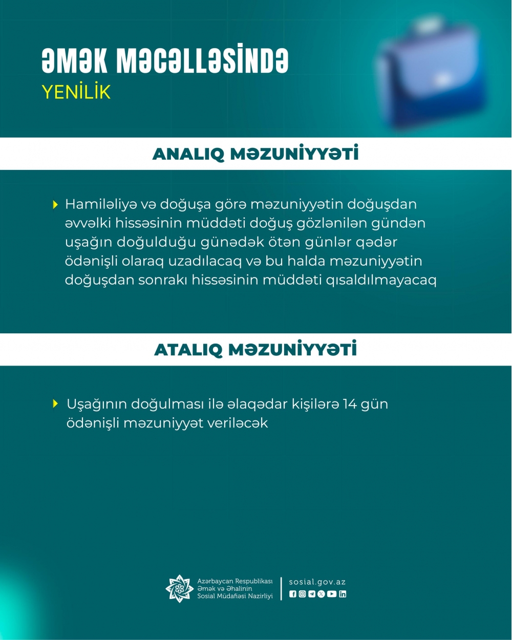 Uşağının doğulması ilə əlaqədar kişilərə 14 təqvim günü ödənişli məzuniyyətin verilməsi;