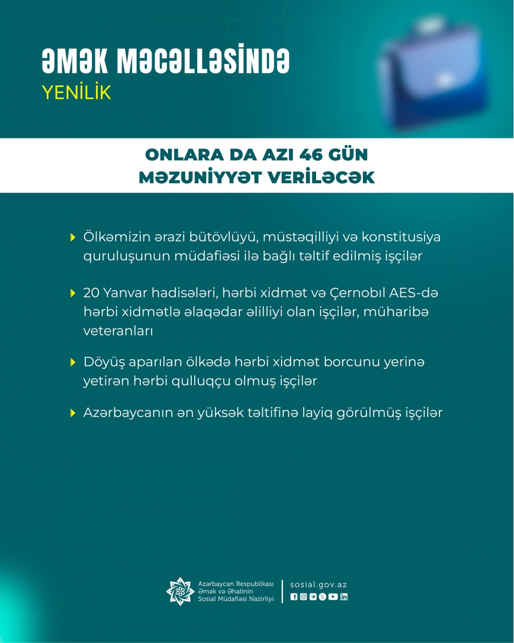 Azı 46 təqvim günü əmək məzuniyyəti verilən işçilərin sırasına ölkəmizin ərazi bütövlüyünün, müstəqilliyinin və konstitusiya quruluşunun müdafiəsi, 20 Yanvar, hərbi xidmət vəzifələrini (xidməti vəzifələri) yerinə yetirməklə və ya Çernobıl AES-də hərbi xidmət vəzifələrini (xidməti vəzifələri) yerinə yetirməklə əlaqədar səbəblərdən əlilliyi olan işçilər, Azərbaycan Respublikasının ərazi bütövlüyü uğrunda aparılan döyüş əməliyyatlarında iştirak etdiyinə görə “Müharibə veteranı” adı almış işçilər, döyüş əməliyyatı aparılan ölkədə hərbi xidmət borcunu yerinə yetirmiş hərbi qulluqçu olmuş işçilər, Azərbaycan Respublikasının ən yüksək təltifinə layiq görülmüş işçilərin də daxil edilməsi;