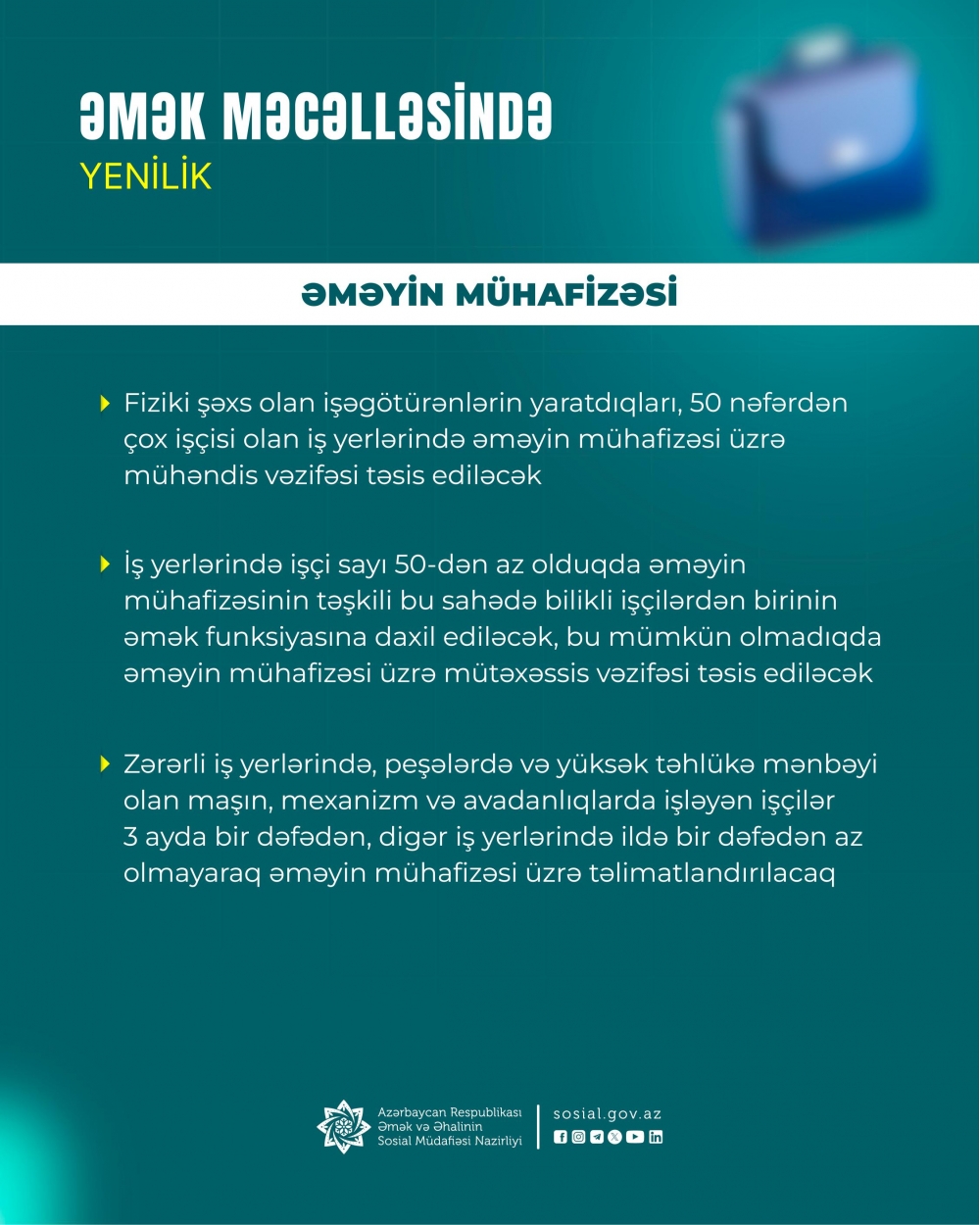 Fiziki şəxs olan işəgötürənlərin yaratdıqları, işçilərin sayı 50-dən çox olan iş yerlərində əməyin mühafizəsi üzrə mühəndis vəzifəsinin təsis edilməsi;