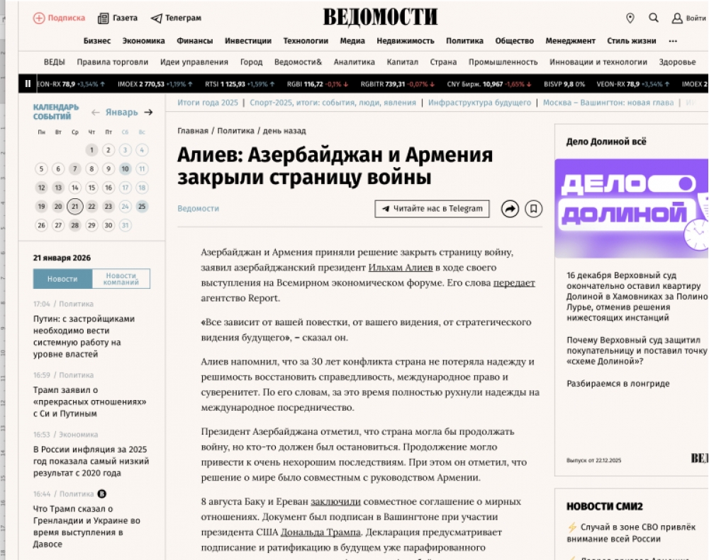 Türkiyənin “Anadolu“, “İhlas“ xəbər agentlikləri, Rusiyanın “Kommersant“, “Komsomolskaya pravda“, “Vedomosti“, “Vesti“, “Qazeta“ qəzet və portalları, “TASS“ xəbər agentliyi, ərəbdilli “lebanon24“, “Al bayader“ portalları” Prezident İlham Əliyevin çıxışına istinadla Azərbaycanın və Ermənistanın müharibə fəslini bağladığını qeyd ediblər. Dövlətimizin başçısı qeyd edib ki, otuz il əziyyət çəkmiş ölkənin lideri olaraq lazımi vaxtda dayanmaq olduqca məsuliyyətli və vacib qərar idi. Sonsuz müharibələr daha çox əziyyət və qurbanlar ilə nəticələnəcəkdi. “Beləliklə, müharibə heç vaxt bitməyəcəkdi. Kimsə bunu dayandırmalı idi və biz buna son qoymaq qərarına gəldik. Bəli, həmin fəsli bağlamaq və sülh üçün imkanları görməklə bağlı qərar Azərbaycan və Ermənistan liderlərinin birgə qərarı idi”, - deyə Azərbaycan Prezidenti vurğulayıb.