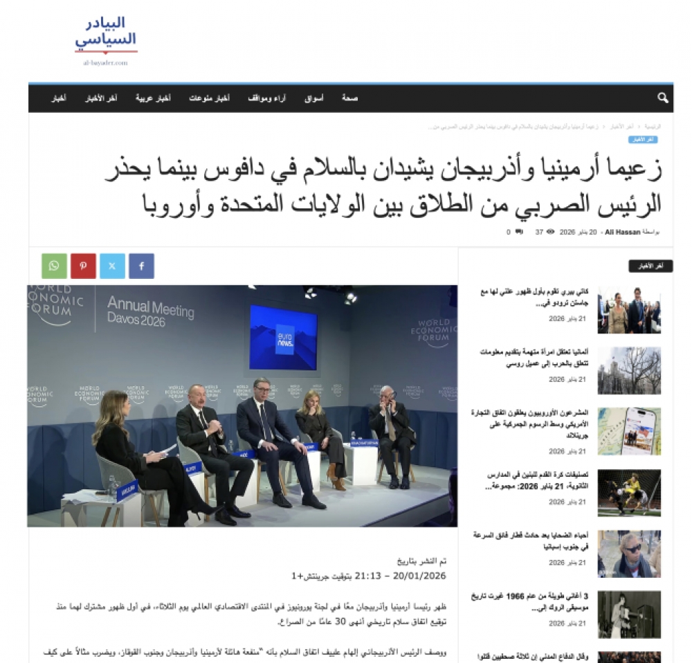 “gulfpress.net“, “inkl.com“, “indexbox.io“, “alsaudiapress.com“ portalları isə Azərbaycan Prezidentinin Davosda beynəlxalq hüquq, Avropanın enerji təhlükəsizliyi və enerji təchizatının geosiyasi aspektləri barədə fikirlərinə yer ayırıblar. Qeyd edilib ki, Avropanın enerji təchizat mənbələrini şaxələndirməyə çalışdığı bir dövrdə Azərbaycan Avropa enerji bazarlarında sürətlə mühüm oyunçuya çevrilib. Prezident Əliyevin sözlərinə görə, hazırda Azərbaycan 16 dövlətə, o cümlədən Avropa İttifaqının 10 üzvünə təbii qaz ixrac edir. Bu geniş şəbəkə Azərbaycanı boru kəmərləri vasitəsilə qaz təchiz edən aparıcı qlobal ölkələrdən birinə çevirir ki, bu da təhlükəsiz və etibarlı enerji infrastrukturunun ön plana çıxdığı bir bazarda mühüm fərqləndirici cəhətdir.