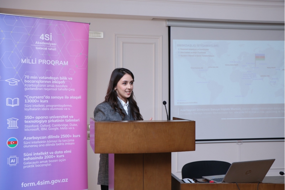 4SİM-in icraçı direktoru Fariz Cəfərov rəhbərlik etdiyi qurumun fəaliyyət istiqamətləri, insan kapitalının inkişafına yönəlmiş “4Sİ Akademiyası” çərçivəsində həyata keçirilən “Milli Proqram” haqqında məlumat verib. AzMİU-nun 600-dən çox əməkdaş və tələbəsinin proqramdan faydalanaraq “Coursera” platormasında 1000-dən çox təlimi uğurla başa vurduğu qeyd edilib.