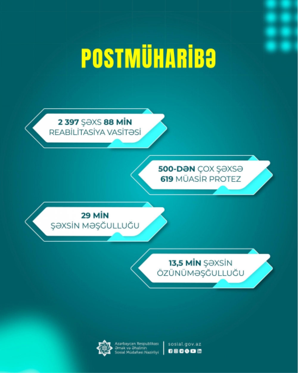Şəhid ailələri üzvləri və müharibə iştirakçıları olan 11 min şəxsə 96 min sosial-psixoloji dəstək və reabilitasiya xidməti göstərilib, müharibə ilə əlaqədar əlilliyi olan 2397 şəxs 88 min reabilitasiya vasitəsi, o cümlədən 500-dən çox şəxs 619 ədəd yüksək texnologiyalı müasir protezlə təmin olunub. 29 min şəxsin məşğulluğu təmin edilib, o cümlədən 13,5 min şəxs özünüməşğulluq proqramına cəlb olunub.