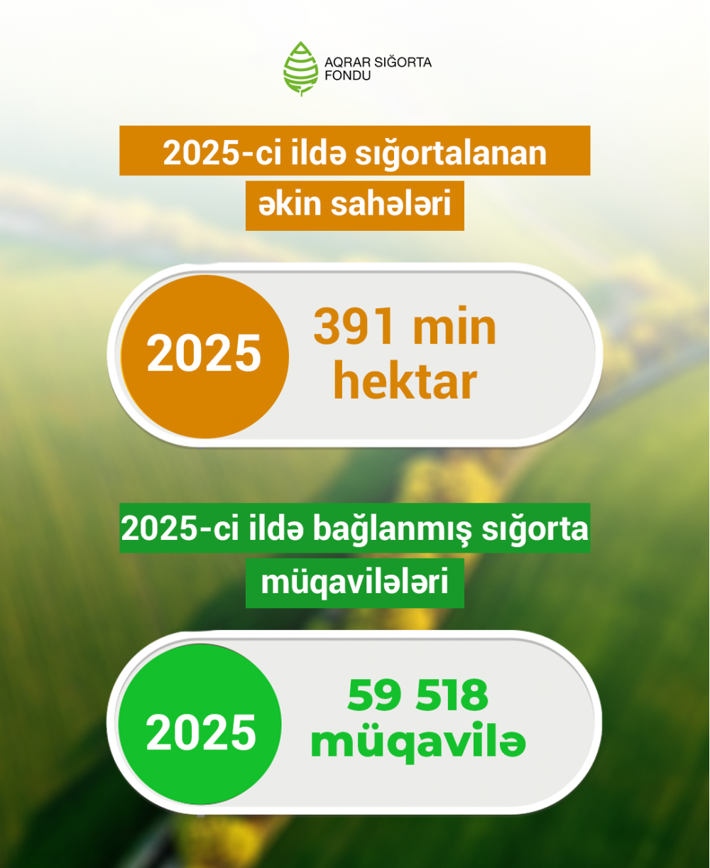 Əkin sahələrinin sığortalanmasından 13 milyon manat aqrar sığorta haqqı toplanılıb. Bunun müqabilində sığorta müqavilələri üzrə əkin sahələrinə 577 milyon manat sığorta təminatı verilib. Əkin sahələrinə verilən sığorta təminatının məbləği 2024-cü illə müqayisədə 64 milyon manat, 2023-cü illə müqayisədə isə 71 milyon manat artıb.