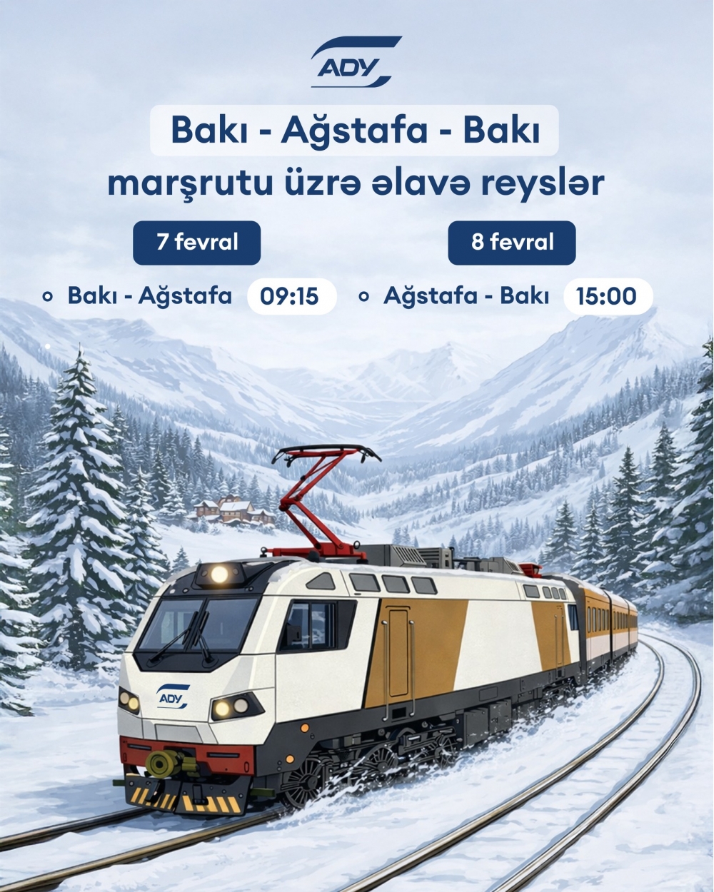 "Azərbaycan Dəmir Yolları" QSC-nin (ADY) artan sərnişin tələbatını təmin etmək məqsədilə 7 və 8 fevral tarixlərində Bakı-Ağstafa-Bakı istiqamətində əlavə qatar reysləri təyin edir.