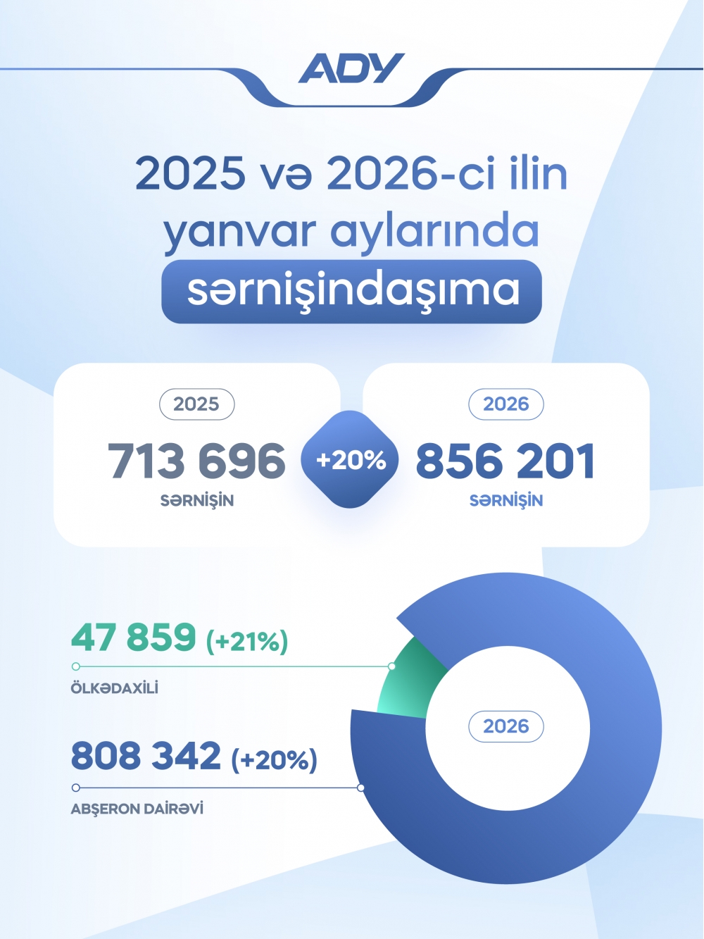 Təkcə, bu ilin yanvar ayında ölkədaxili 47 min 859 min sərnişin daşınıb ki, bu, 2025-ci ilin yanvar ayı ilə müqayisədə 21 % çoxdur.