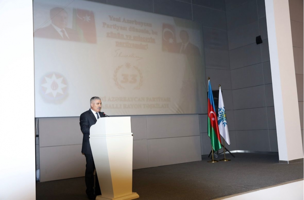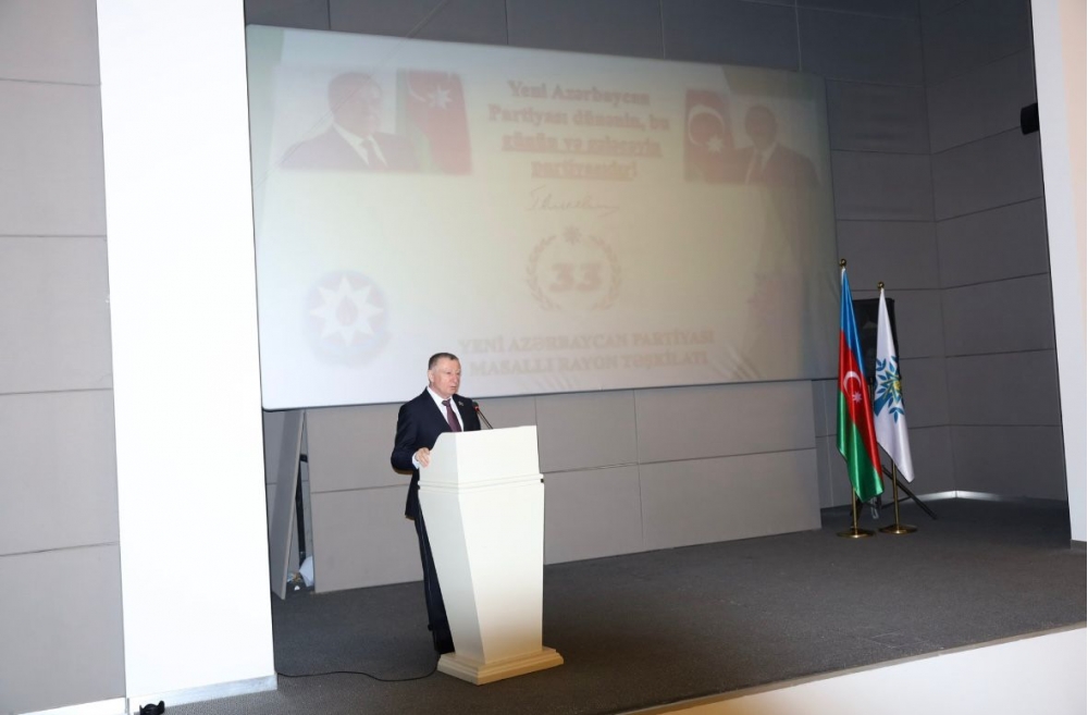 Yeni Azərbaycan Partiyası Masallı rayon təşkilatının sədri Seyfəddin Əliyev tədbir iştirakçılarını partiyanın Masallı rayon təşkilatının yaradılmasının 33-cü ildönümü münasibətilə təbrik etmiş, çıxış edərək xalqımızın böyük oğlu Heydər Əliyevin banisi olduğu tarixi zərurətdən yaranan Yeni Azərbaycan Partiyasının bu günə qədər keçdiyi siyasi mübarizələrlə dolu şərəfli yolundan danışıb. Bildirib ki, dahi şəxsiyyətin üzərinə böyük bir tarixi missiya götürərək yaratdığı Yeni Azərbaycan Partiyası müstəqil Azərbaycanın tarixində çox önəmli bir hadisə oldu. Qısa müddət ərzində cəmiyyətin aparıcı qüvvəsinə çevrilərək “Dünənin, bu günün və gələcəyin” partiyasına çevrildi. Bu gün partiya öz sıralarında vətənini sevən və xalqına sadiq olan vətəndaşların yer aldığı partiyadır. Bu gün əsası Heydər Əliyev tərəfindən qoyulan partiya ən şanlı tarixini yaşayır. Tarixin ciddi sınaqlarından çıxmış Yeni Azərbaycan Partiyası saysız-hesabsız tarixi nailiyyətlərə imza atmaqla daha da möhkəmlənib, daha da inkişaf edib. Ötən illər ərzində ölkəmizdə siyasi sabitliyin davamlı inkişafın təminatçısı kimi xalqın böyük əksəriyyətinin etimadını qazanıb.