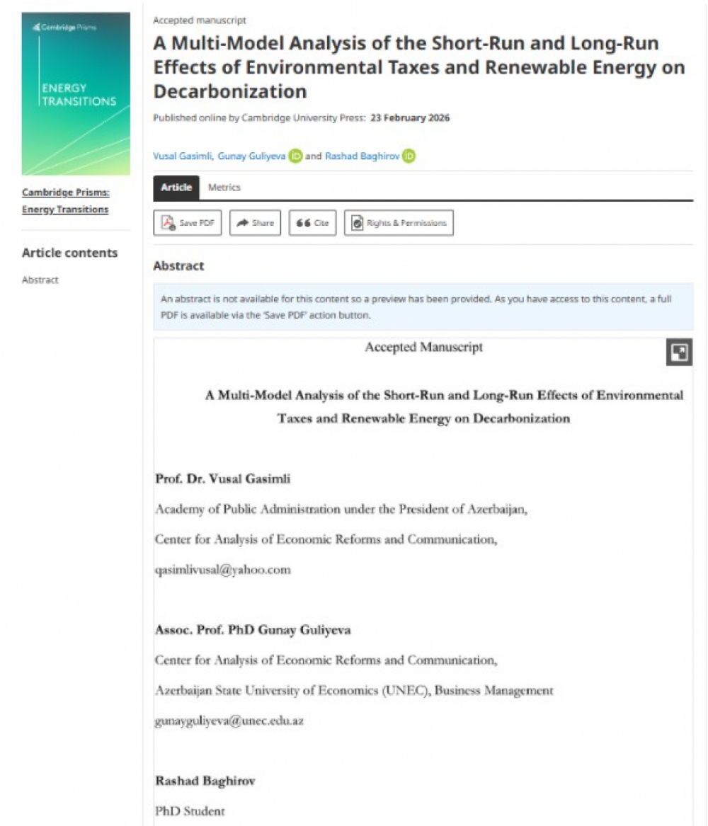 “Ətraf mühit vergiləri və bərpa olunan enerjinin dekarbonizasiyaya qısa və uzunmüddətli təsirlərinin multimodal təhlili” (A Multi-Model Analysis of the Short-Run and Long-Run Effects of Environmental Taxes and Renewable Energy on Decarbonization) adlı məqalədə iqlim dəyişikliyi ilə mübarizə və karbon emissiyalarının azaldılması istiqamətində fiskal alətlər və enerji keçidinin rolu kompleks modellər vasitəsilə qiymətləndirilib. Tədqiqatda həm vergi siyasətinin, həm də bərpa olunan enerji investisiyalarının iqtisadi artım və emissiya dinamikasına təsirləri müqayisəli təhlil edilib.