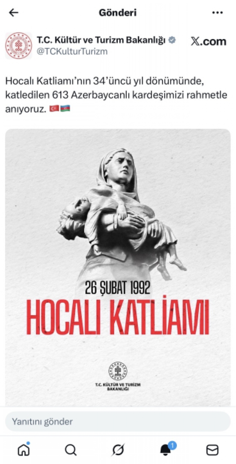 Türkiyənin Mədəniyyət və Turizm Nazirliyi Xocalı soyqırımının 34-cü ildönümü ilə əlaqədar başsağlığı mesajı yayımlayıb.