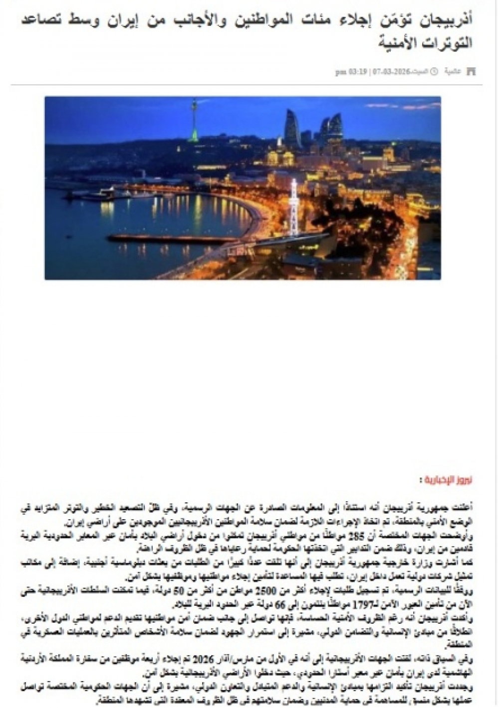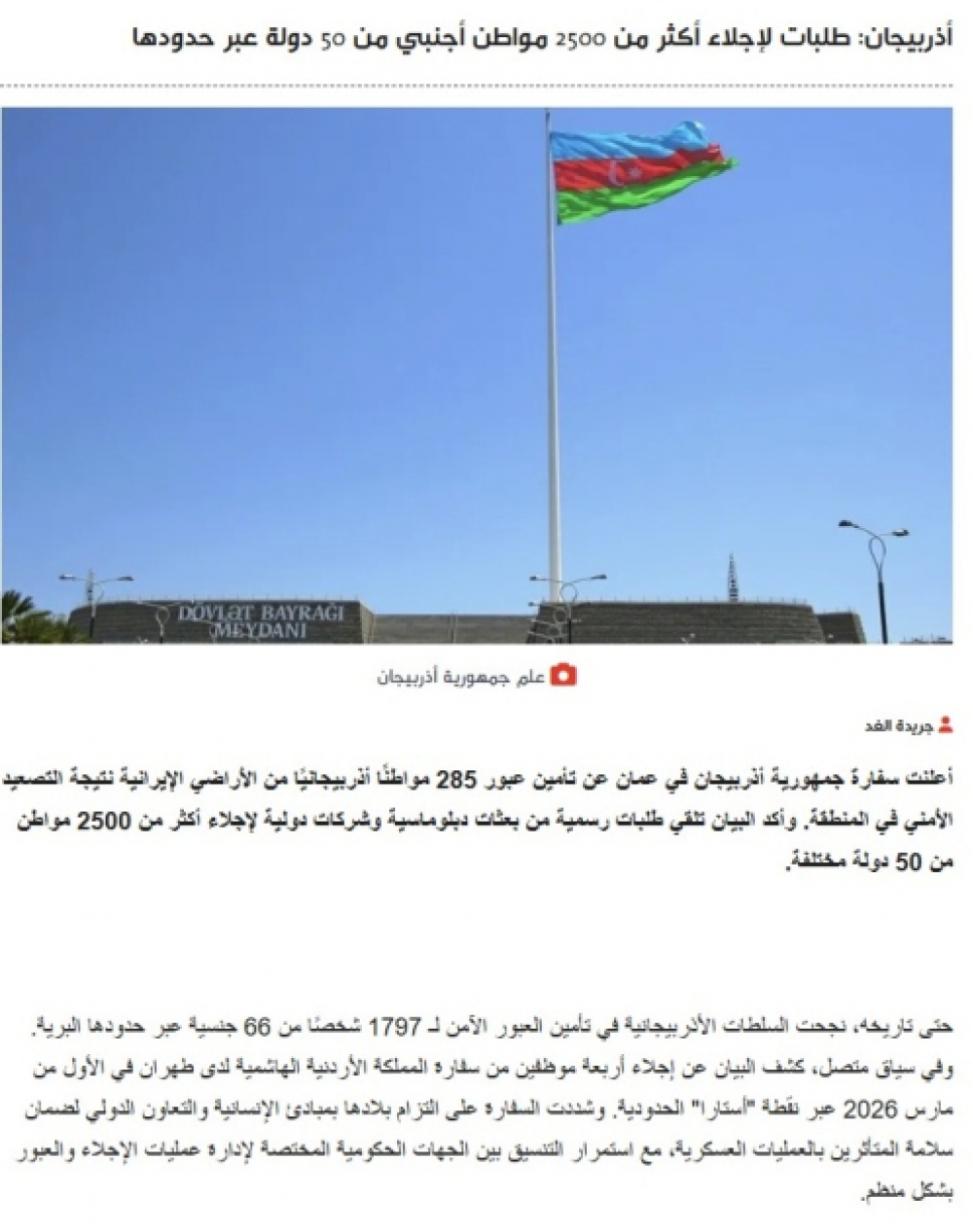 İordaniya mətbuatında regionda yaranmış gərgin təhlükəsizlik vəziyyəti fonunda Azərbaycan Respublikasının həyata keçirdiyi təxliyə tədbirləri ilə bağlı məlumatlar dərc olunub.