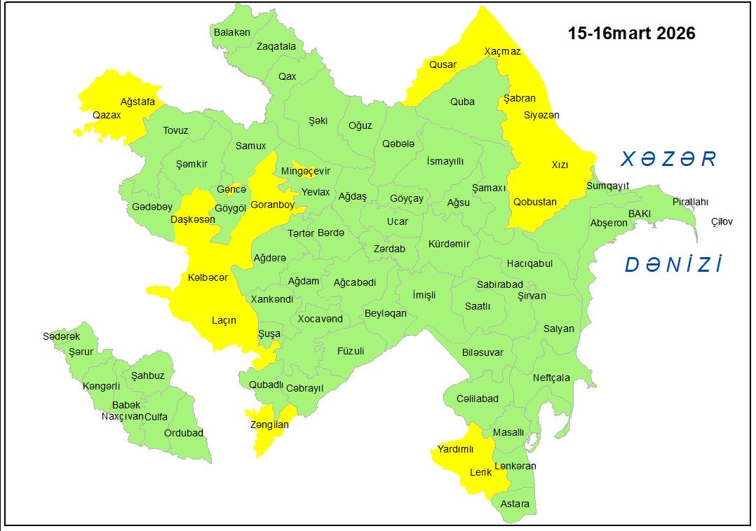 Milli Hidrometeorologiya Xidməti martın 15-16-da bəzi bölgələrdə gözlənilən küləkli hava şəraiti ilə bağlı sarı xəbərdarlıq verib.