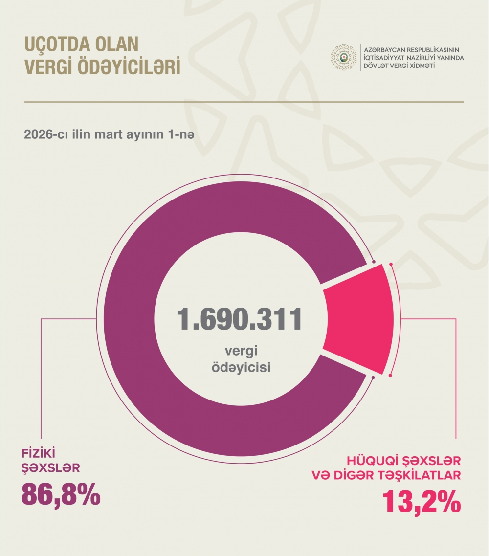 2026-cı ilin mart ayının 1-nə respublika üzrə uçotda olan 1.690.311 vergi ödəyicisinin 86,8 faizi fiziki şəxslər, 13,2 faizi hüquqi şəxs və digər təşkilatlar olub. “İki sahil” xəbər verir ki, [tən ilin müvafiq dövrü ilə müqayisədə vergi ödəyicilərinin ümumi sayı 4,9 faiz, o cümlədən fiziki şəxslərin sayı 4,7 faiz, hüquqi şəxslərin sayı 6,3 faiz artıb.
