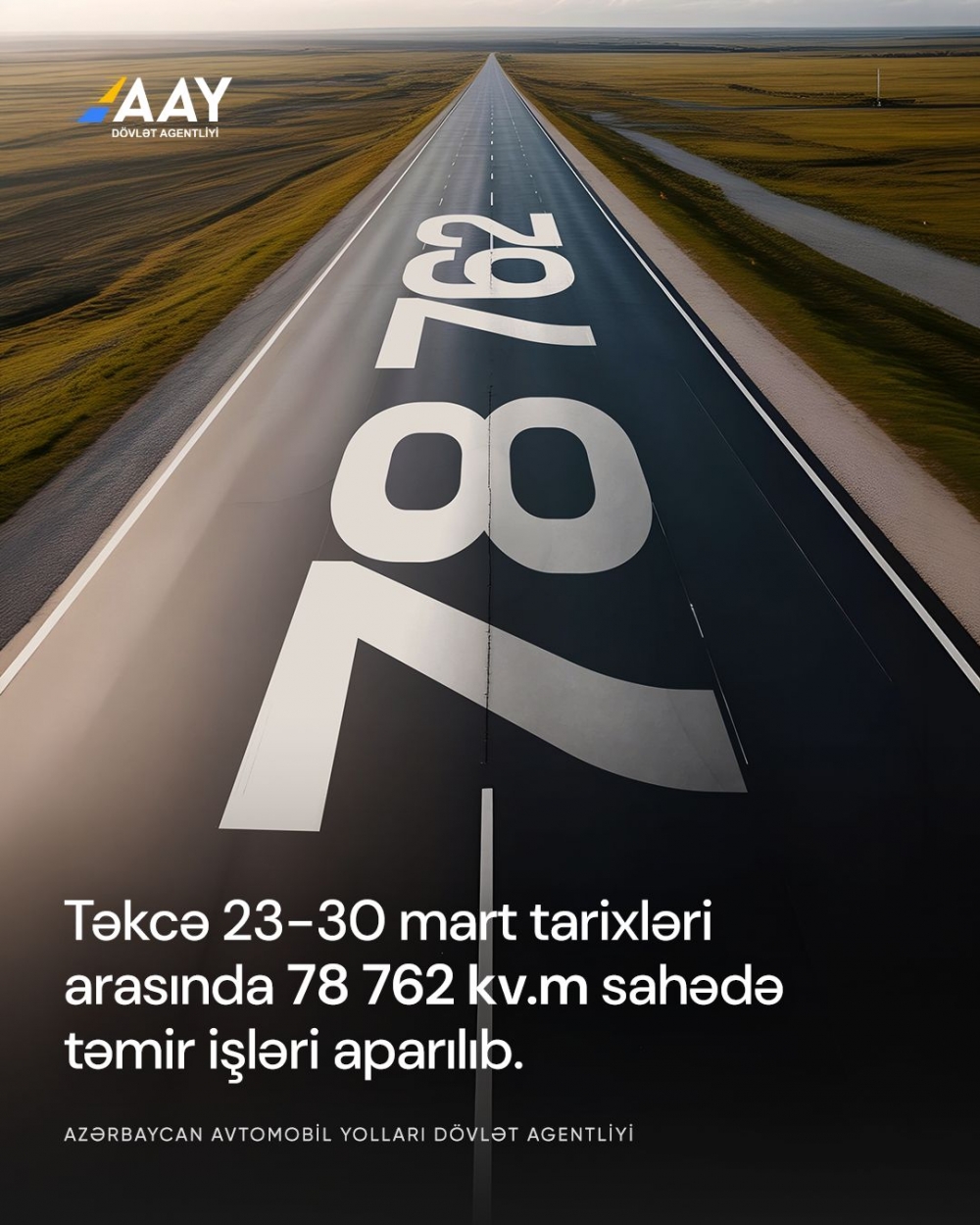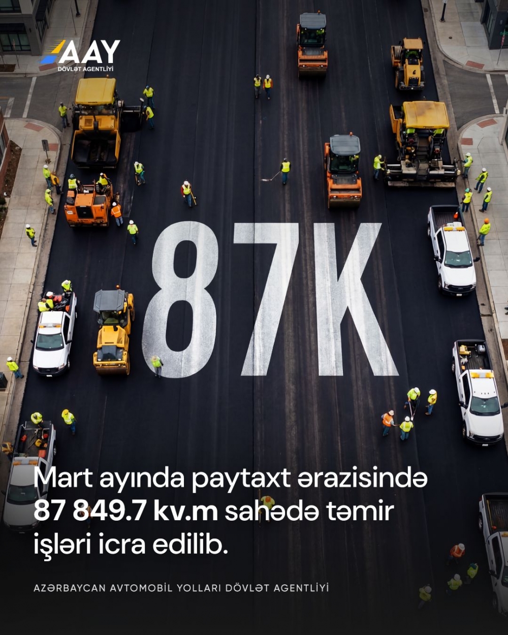 Təkcə bayram günlərində, yəni 23-30 mart tarixləri arasında gündüz və gecə fasiləsiz fəaliyyət göstərən işçi heyəti sayəsində paytaxtda nəqliyyat sıxlığının azalmasından istifadə olunmaqla 78 762 kv.m sahədə təmir işləri aparılıb.