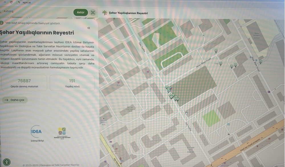 Xidmət rəisi əlavə edib ki, ərazidə aparılan işlər çərçivəsində ağacların inventarlaşdırılması və identifikasiyası da həyata keçirilib. Belə ki, 2025-ci ildən IDEA İctimai Birliyinin təşəbbüsü və Ekologiya və Təbii Sərvətlər Nazirliyinin dəstəyi ilə şəhər yaşıllıqlarının qeydiyyata alınması və identifikasiyası istiqamətində fəaliyyətə başlanılıb və bu məqsədlə agac.az portalı yaradılıb. Bu layihənin həyata keçirilməsi şəhər ərazisində yaşıllıqların uçotunun aparılması, görülən işlərin sistemli şəkildə izlənilməsi və bu sahədə şəffaflığın təmin edilməsi baxımından mühüm əhəmiyyət daşıyır.