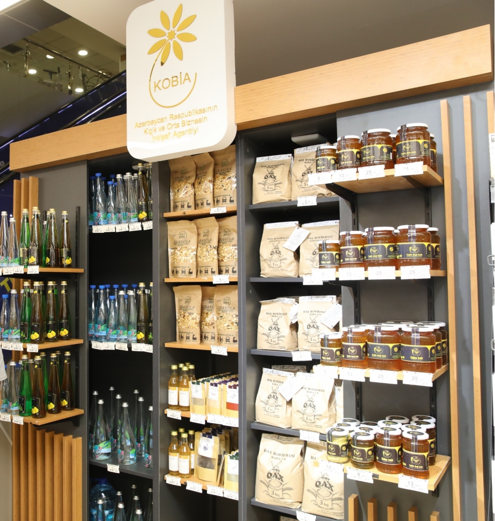- Mikro və kiçik sahibkarların ticarət şəbəkələrinə çıxışında qarşılaşdıqları çətinlikləri nəzərə alaraq KOBİA bu istiqamətdə xüsusi dəstək mexanizmi təqdim edir. Müvafiq qaydalara əsasən Agentlik iri ticarət şəbəkələrinin mağazalarında icarəyə yer götürərək vahid stendlər yaradır və sahibkarların məhsullarını bu satış nöqtələrində yerləşdirir. Məqsəd yerli istehsal məhsullarının tanıdılması və satış imkanlarının artırılmasıdır.