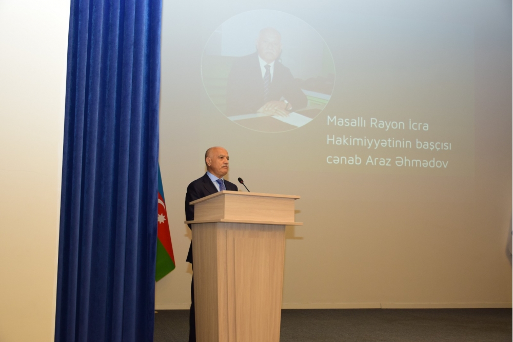Masallı rayon İcra Hakimiyyətinin başçısı Araz Əhmədov Ulu Öndərin öz mənalı və zəngin ömrünü bütövlükdə millətinə, xalqına, Vətəninə və dövlətinə həsr etdiyini, müqəddəs amallar uğrunda müstəsna fəaliyyət göstərdiyini diqqətə çatdırıb. Qeyd edib ki, məhz Ulu Öndərin gərgin əməyi və qətiyyətli siyasəti sayəsində yeni, müasir Azərbaycan dövləti qurulmuş, ölkəmiz dünya məkanında öz layiqli yerini tutmuşdur. Natiq bildirib ki, dövlətimizin başçısı cənab İlham Əliyev prezidentlik dövründə sadə vətəndaşların, şəhid ailələrinin, müharibə əlillərinin yanında olub, onlara mütəmadi qayğı və diqqət göstərib. Məhz bunun nəticəsidir ki, ümumxalq məhəbbətini qazanan cənab İlham Əliyev xalqın bütün təbəqələri tərəfindən sevilməkdədir.